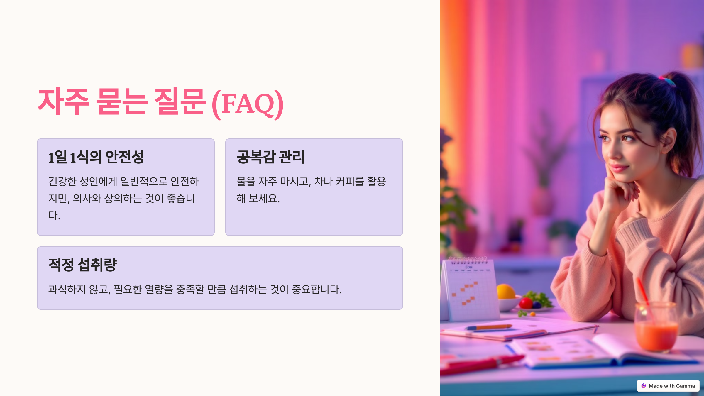 A. 일반적으로 건강한 성인에게 안전하지만, 개인의 체질이나 건강 상태에 따라 다를 수 있으니 의사와 상의하세요.