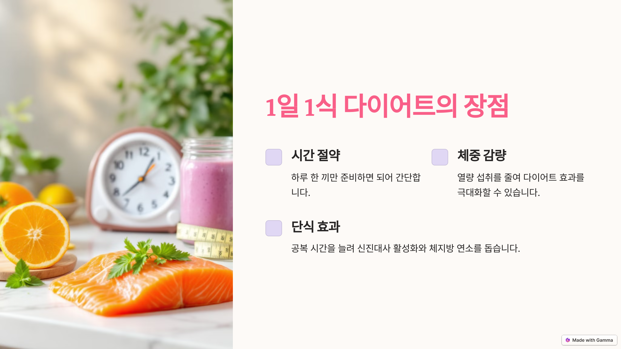 - 🕐 단식 효과: 공복 시간을 늘리면 신진대사가 활성화되고, 체지방 연소를 도와줍니다.