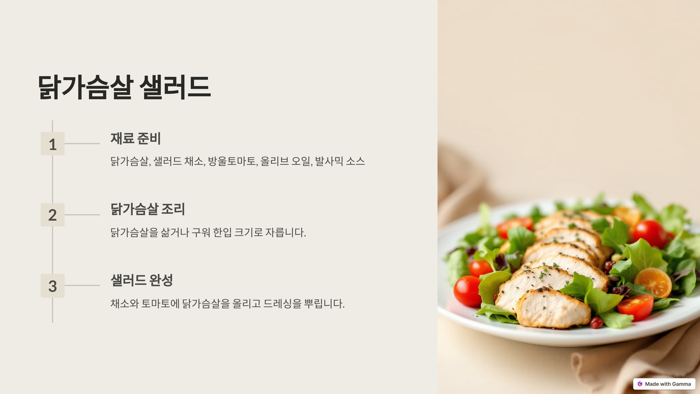 - 닭가슴살을 삶거나 그릴에 구워 한입 크기로 자릅니다.