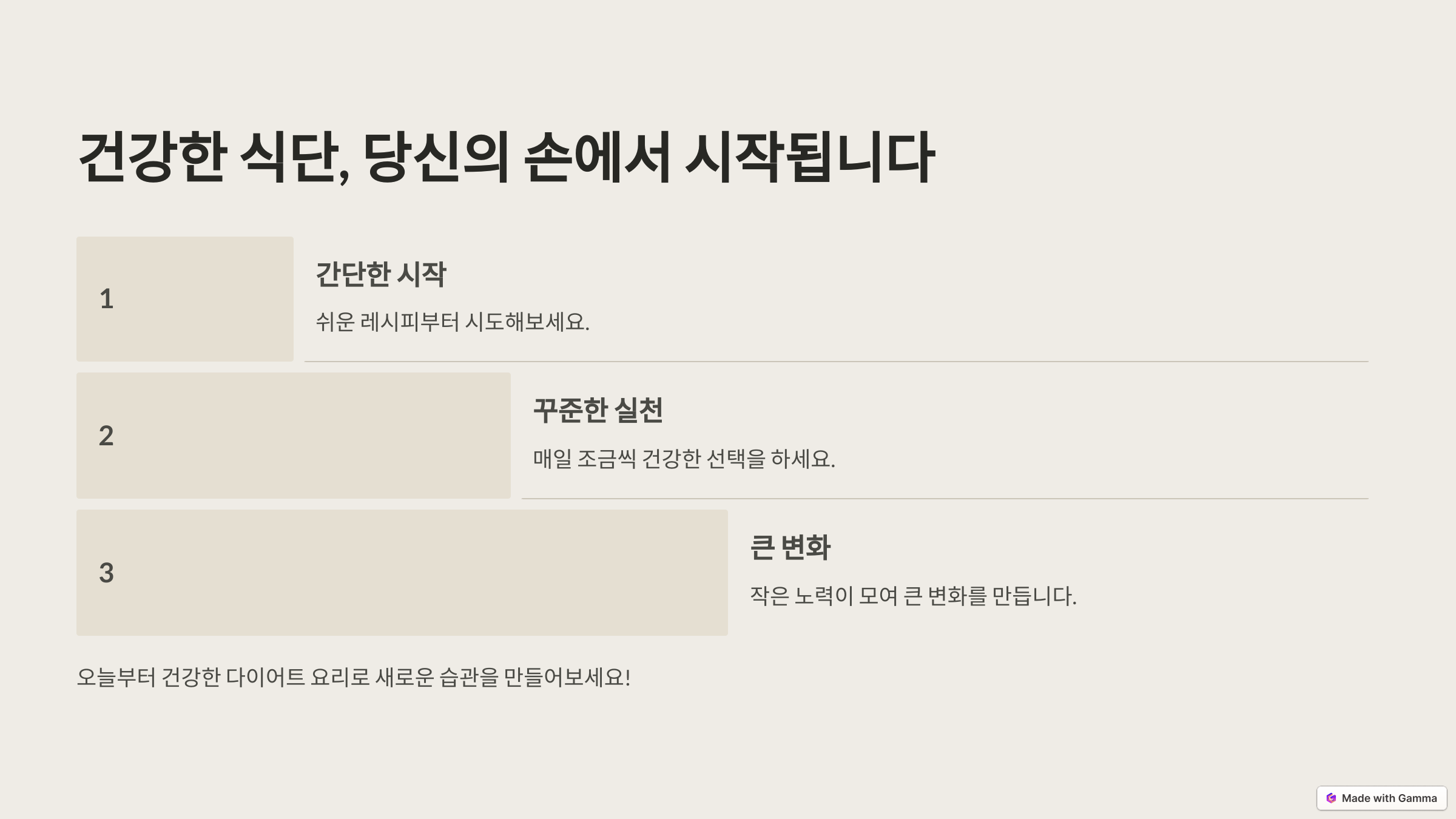다이어트를 위해 굶거나 맛없는 음식을 참을 필요는 없습니다. 위에서 소개한 요리법처럼 간단하면서도 맛있는 다이어트 식단을 실천해 보세요. 매일 조금씩 건강한 선택을 하면, 큰 변화를 이끌어낼 수 있을 거예요! 오늘 저녁은 어떤 요리를 만들어 볼까요? 😊