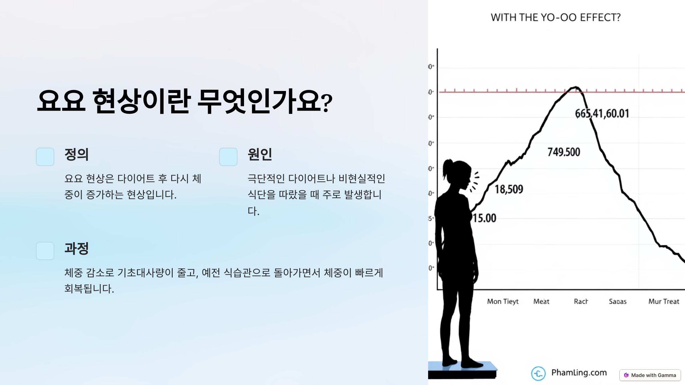 요요 현상은 다이어트 후 다시 체중이 증가하는 현상을 말합니다. 주로 극단적인 다이어트 방법이나 비현실적인 식단을 따랐을 때 발생합니다.