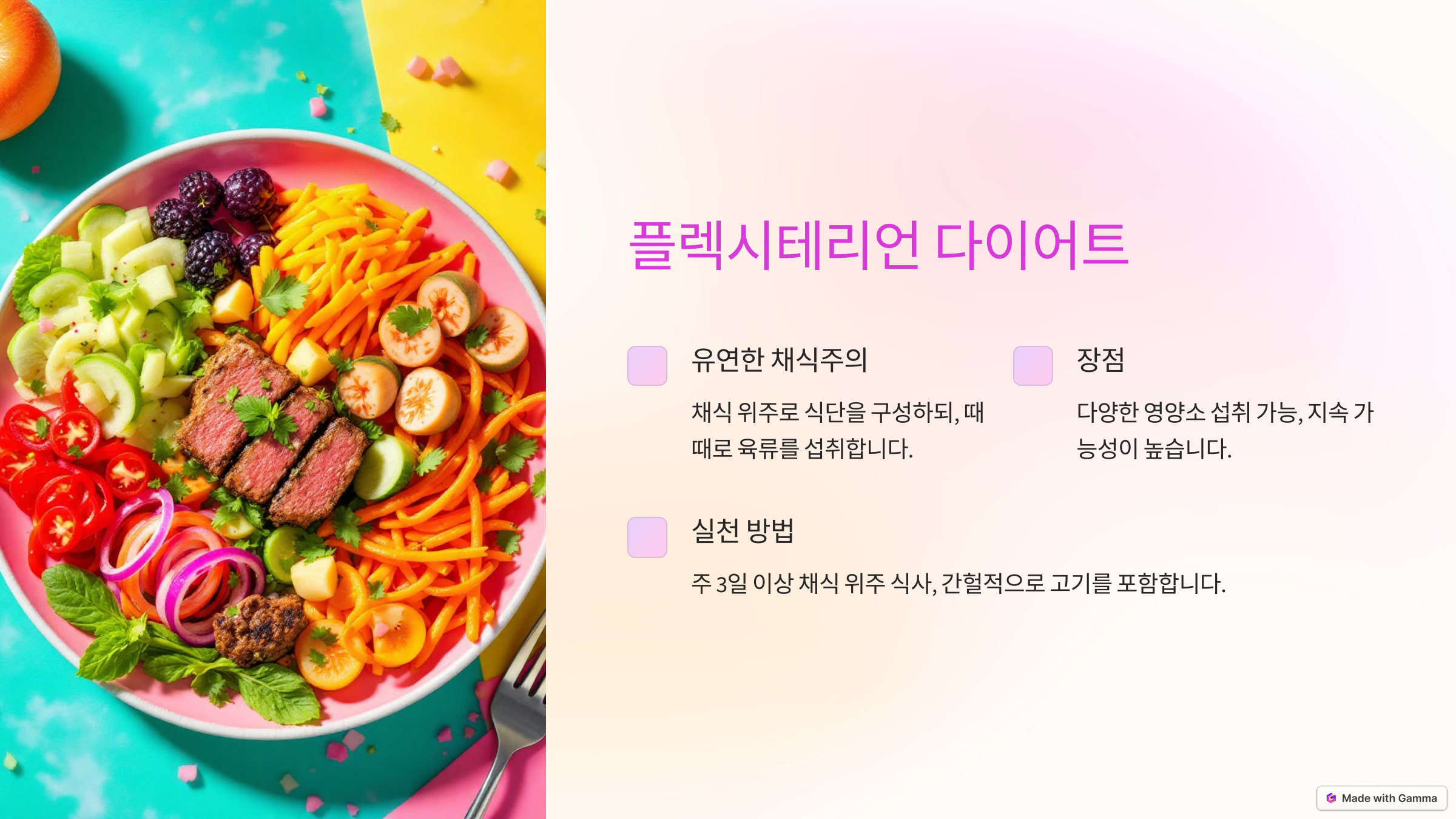 - 장점: 다양한 영양소 섭취 가능, 지속 가능성 높음.