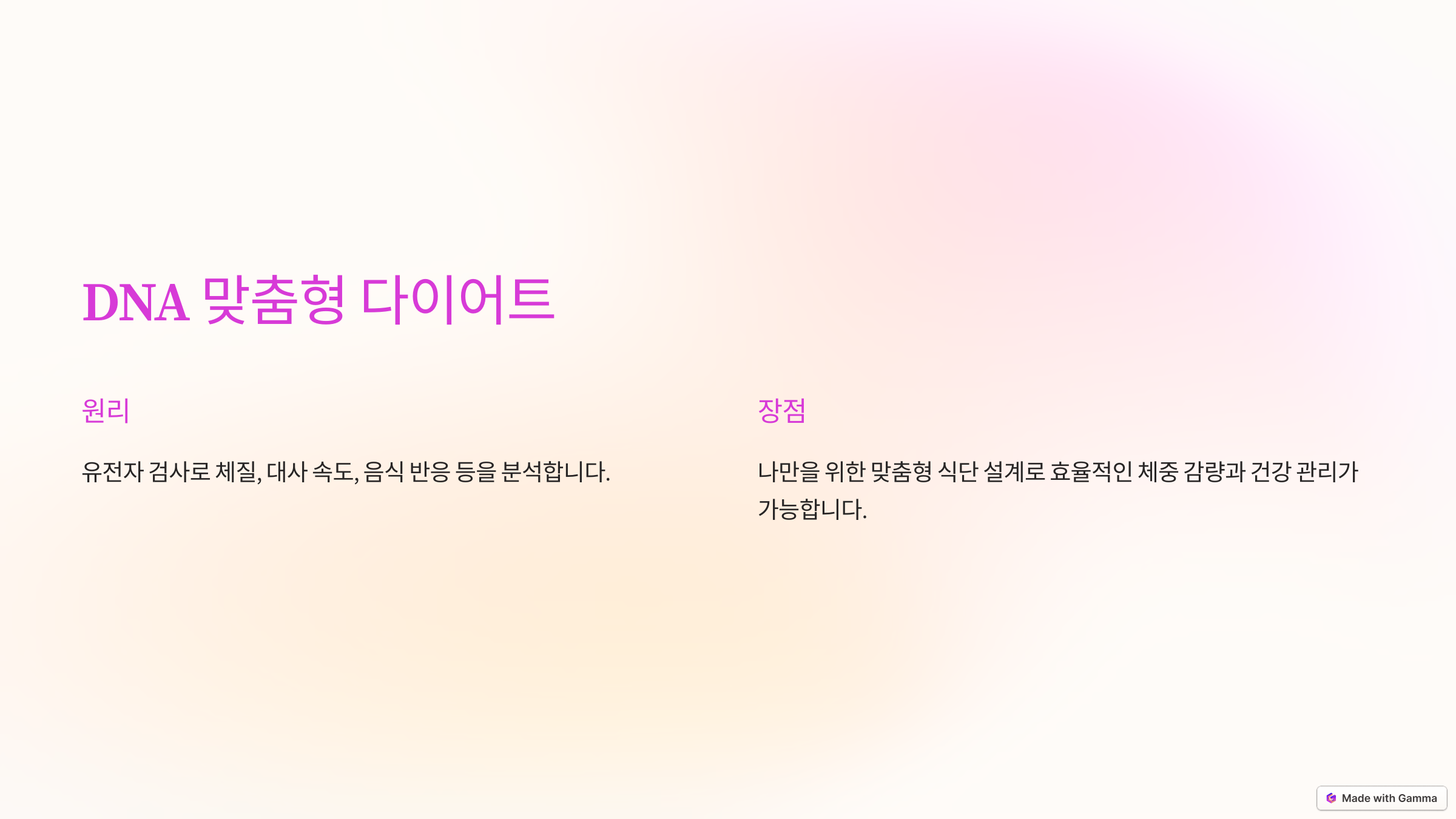 - 원리: 유전자 검사로 체질, 대사 속도, 음식 반응 등을 분석.